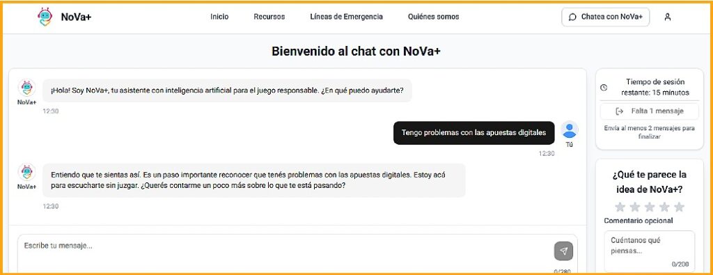 La posibilidad de chatear con NoVa+ dura 15 minutos. Sin embargo, cuando una escuela desea utilizarlo como un plan institucional para prevenir la ludopatía en sus estudiantes, el equipo de la UNSL habilita la licencia de uso ilimitado. González agrega: “La idea es conseguir financiamiento externo para lograr una versión más libre y amplia y que se pueda usar durante más tiempo”. Cuando se está por alcanzar el límite de tiempo en la charla, NoVa+ advierte: “Quedan menos de 2 minutos de conversación. Veo que has usado casi todo tu tiempo. Considera contactarte con un profesional o persona física si necesitas más ayuda”.